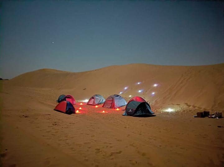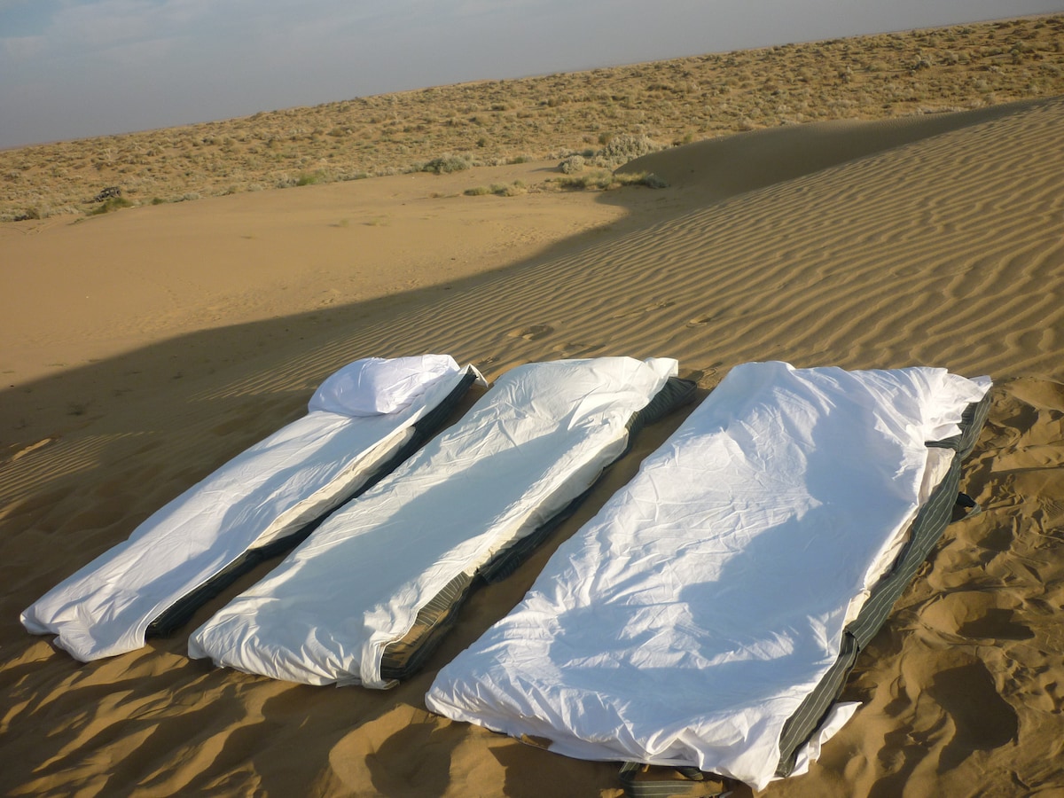 Stay with us in cozy mobile tents or sleep under the stars in outdoor beds, surrounded by the stunning desert landscape. At night, gaze at the galaxy above for an unforgettable stargazing experience. Savor delicious local cuisine, immerse yourself in the vibrant rural life of Rajasthan, and connect with the friendly locals. Enjoy camel rides, explore nearby sights, and participate in colorful festivals and traditions, and so so much more. A true desert adventure awaits you!🏜⛺️