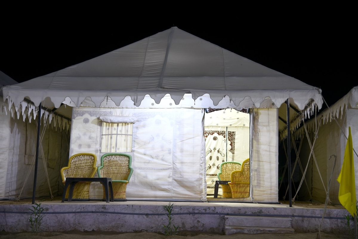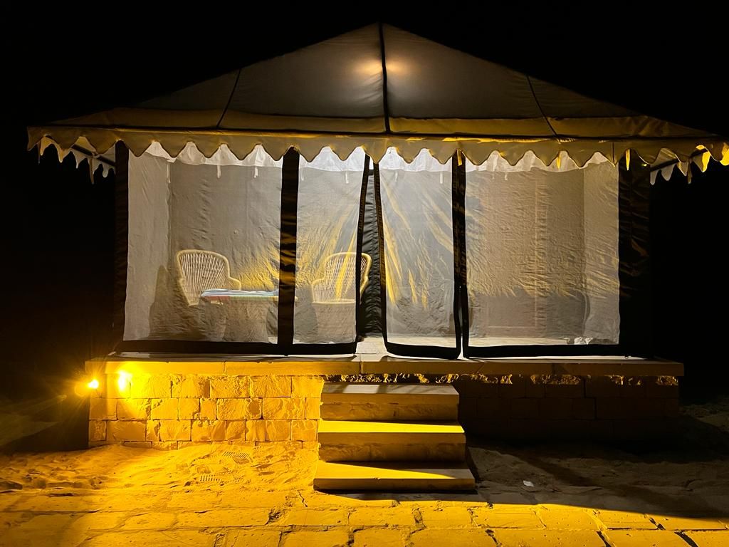 we are locate 40 km far from the Jaisalmer city . we have 28 beautiful Swiss tents .we start every year from 1 Oct. to 31 March .rest time its close . we have some activities there like Camel Safari Jeep Safari ,Village Tour , Stars watching , and more . every evening we have a folk dance and music show at our activities area .