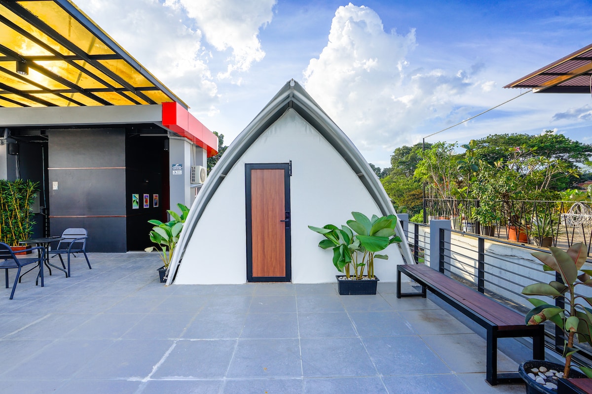 Modern room with pool access or views, designed for relaxation. Enjoy fresh ambience, natural tones, and a calm atmosphere—perfect for unwinding after a day in Bogor. Hebe Hostel, part of the HostelNMC network, is a modern eco-urban hostel located in Bogor, West Java, Indonesia. It blends sustainability, technology, modern glamping rooftop and urban comfort — offering a smart, design-forward accommodation experience for modern travelers and digital nomads.