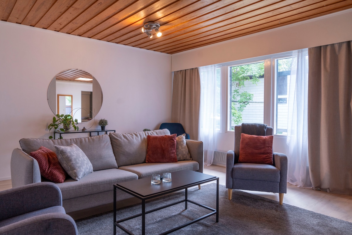 Looking for old house charm with modern twist? Welcome to our house on Seminariegatan in Nykarleby, one of the town's most idyllic locations. Touches of traditional and modern Nordic design. Our house was put up in the year 1900 but the logs probably much older. It is ideal for spending time together in front of the fire, cooking, a walk in the forest, bathing in the outdoor wood heated sauna, or weather allowing hanging out on the terrace. The house is fully equipped.