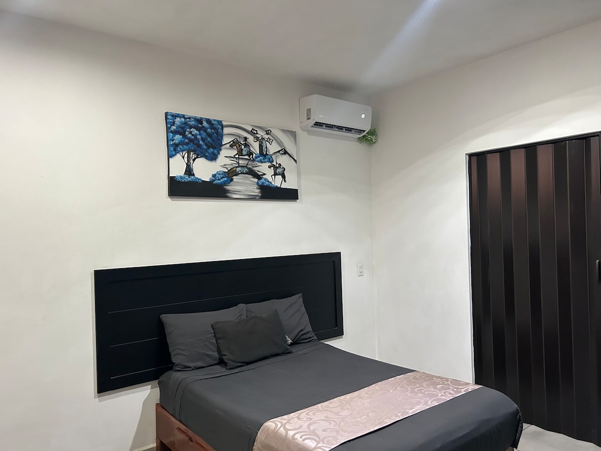 Quédate en este estudio estratégicamente construido para hospedarte de manera tranquila y privada, cuenta con todo lo que necesitas para una cómoda y tranquila estancia Disfruta de este Apartaestudio con todos los servicios para una agradable estadía como lo son agua caliente, Netflix, Internet, frigobar, secadora, Aire acondicionado y escritorio de trabajo A tan solo 13 minutos del centro Centro comercial Sentura a 10 minutos Bodega Aurrera con cajero BBVA a 4 minutos Oxxo a 4 minutos