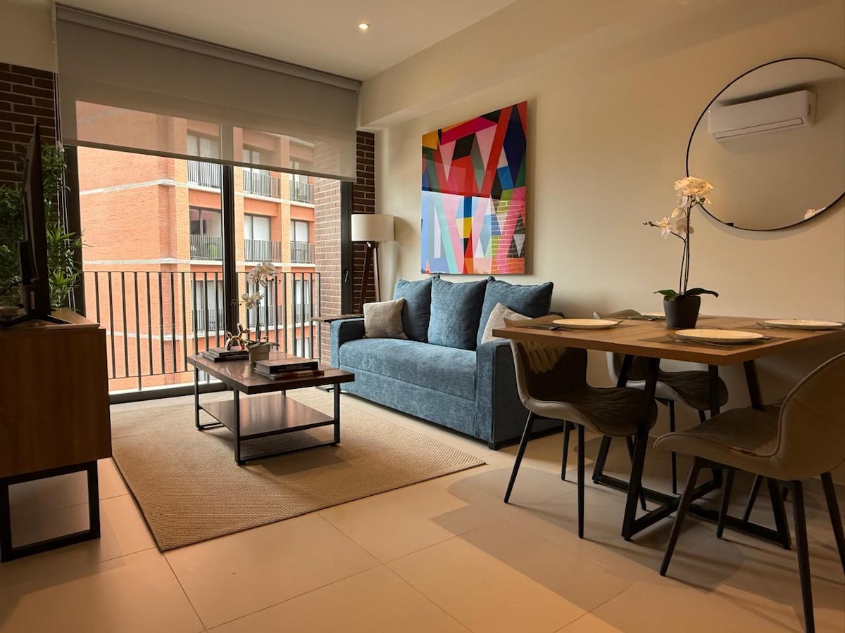 El departamento cuenta con aire acondicionado en RECÁMARA PRINCIPAL. El servicio se contrata por separado. Costo adicional de $99.00 pesos por día. Relájate en este espacio tan tranquilo y elegante. Totalmente nuevo con dos habitaciones. Espacioso para 4 huéspedes. Con opción para un 5to [con costo extra]. Con amenidades [gimnasio, ludoteca, espacio de trabajo, cine]. Excelente ubicación. En el sur de la ciudad. A 5 minutos de la plazas y supermercados. Haremos que tu estancia sea placentera.