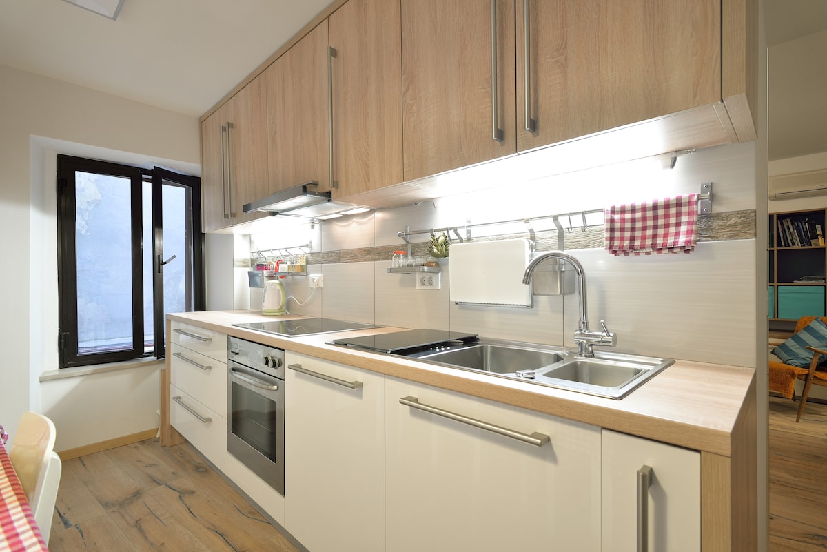 The apartment is situated close Opatija city center, only a few minutes away by car or an eight minutes walk. It consists of a living room, bedroom, a dining room, two bathrooms, kitchen, sauna, open space lounge, terrace, a surrounding garden and a car parking. Thanks to the fact of being in the ground floor with a surrounding garden you have the sensation of renting a house and not an apartment.