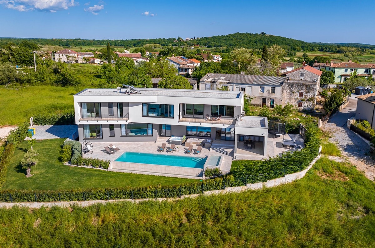 Stylish villa near Rovinj with picture worthy pool, sunk in hot tub, sauna. Wake up to lush, panoramic valley views. Couples and family-friendly, a short drive to adventure park, Brijuni National Park, dinopark, medieval towns & local cuisine. It is a true green escape for anyone looking to get back to nature with all the comfort of modern living. Fully equipped for cooking and entertainment in 2600 m2 of garden (football, speed ball, badminton & pool fun) for your kids and loved ones to enjoy.