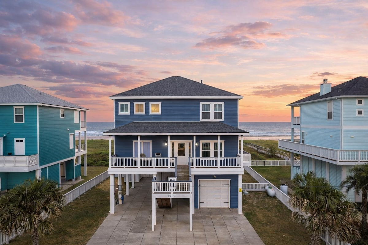 Casa Courageous is located in a quiet beachfront neighborhood on Galveston's West End. There is direct beach access with a 1 min walk over the pedestrian bridge to the water. The beach is closed to vehicles, providing a safe, calm environment for your group to explore. This renovated home has been transformed into a modern beachfront oasis that design lovers will appreciate, with wraparound balconies that provide unobstructed ocean views from both sides of the house.