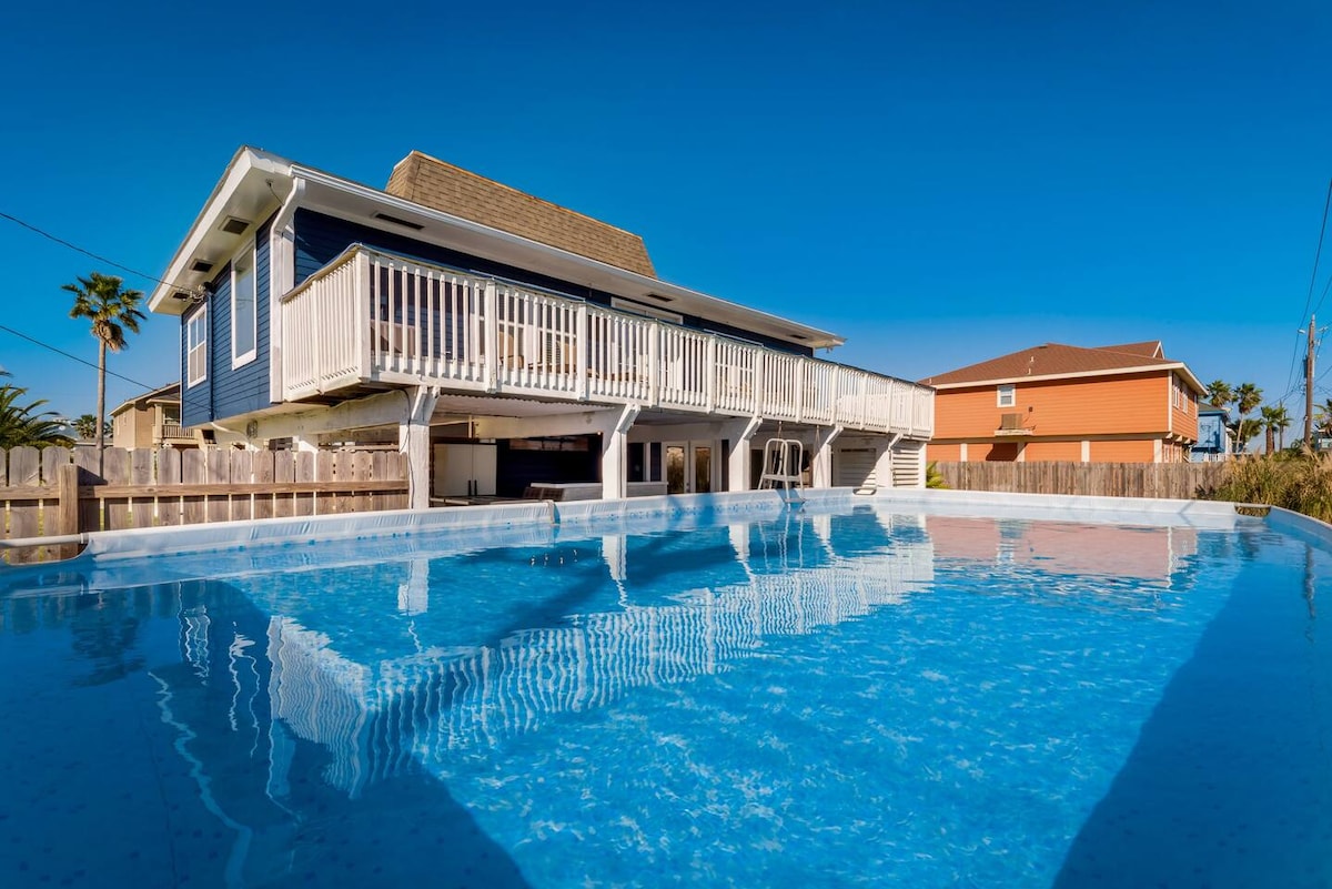 Hasta La Vista! Kick back and relax in this calm, stylish beachside home. Sit out on the deck with your coffee and listen to the songs of the shorebirds and soothing lull of the ocean. Grill up some good times on ground level. Have a delicious cocktail on the patio while playing cornhole. Make sweet s'mores at the fire pit. Take a quick 3-5 minute 1-block walk to the beach without having to dodge traffic or cross a major street. Enjoy all the history and charm of Galveston Island!