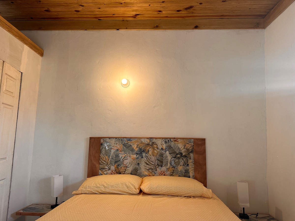 This charming villa room has high ceilings, oversized hand crafted windows, custom double doors and a covered screened porch which adds a comfortable living area great for remote work or just observing the doctor bird floating from flower to flower. The plush queen bed and newly renovated en suite bathroom make this cozy space a dreamy beachside home. This cottage is fan cooled with Hot water shower. Ideal for weekends away or a solo traveler.