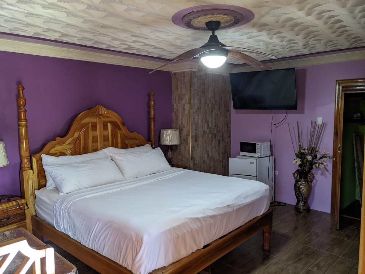This charming villa room has high ceilings, oversized hand crafted windows, custom double doors and a covered screened porch which adds a comfortable living area great for remote work or just observing the doctor bird floating from flower to flower. The plush queen bed and newly renovated en suite bathroom make this cozy space a dreamy beachside home. This cottage is fan cooled with Hot water shower. Ideal for weekends away or a solo traveler.