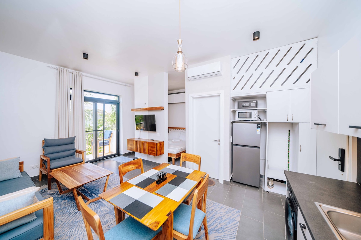 Just a few steps away from the Indian Ocean! UHURU top floor apartment, super king size bed and sofa bed in living room. Fully equipped kitchen, dining/living area. Situated in Jambiani Mfumbwi with the most beautiful turquoise water you ever seen. TV with Netflix access, AC rooms, Fast Wi-Fi, daily housekeeping, private parking, terrace and security, safe box, Iron and boards, hair dryer. There is no such a place like this in whole Zanzibar! Private roof top terrace with sun set/sun rise view