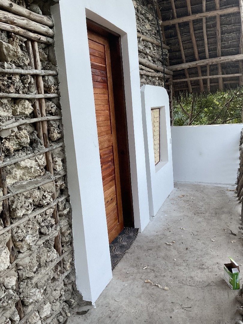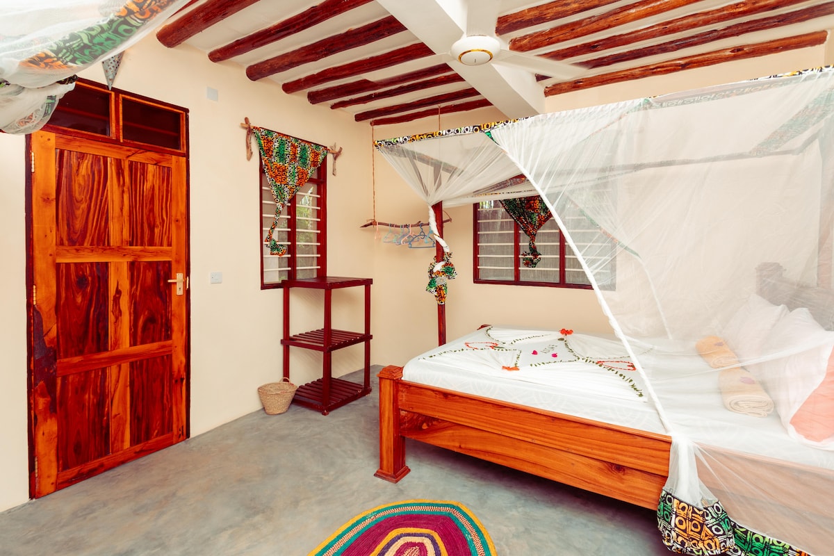Escape to our tranquil guesthouse nestled in Zanzibar's bush. A pacious and bright room offers private bathroom, balcony and entrance. The room boasts a large-sized bed(185x190cm) for ultimate comfort. Share our outdoor kitchen and covered sitting area. Our gym is located nearby (5 walking minutes); yoga, dance, boxing and fitness classes are available for an additional charge. The beautiful beach with restaurants is a 10-minute walk away. Experience serenity and convenience in paradise.