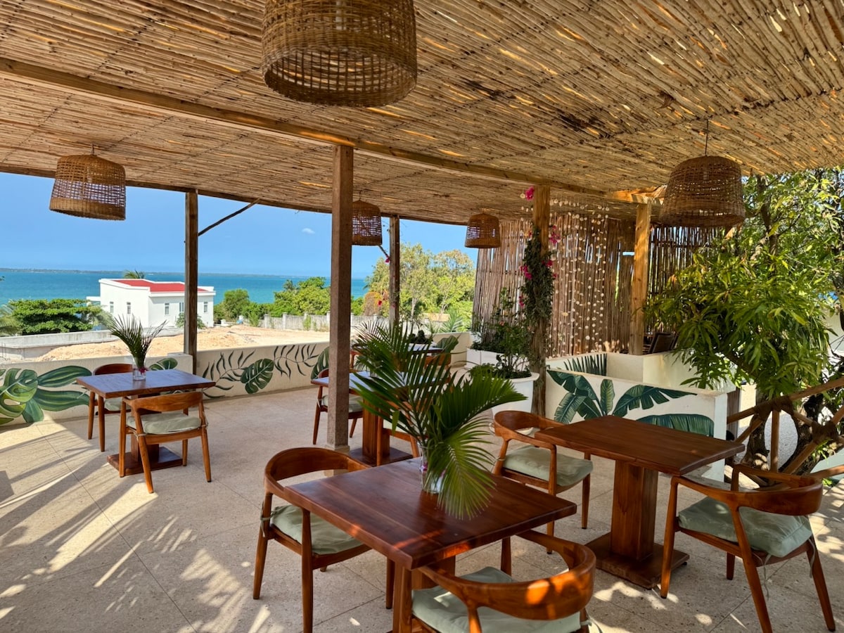Just a few steps away from the Indian Ocean! UHURU top floor apartment, super king size bed and sofa bed in living room. Fully equipped kitchen, dining/living area. Situated in Jambiani Mfumbwi with the most beautiful turquoise water you ever seen. TV with Netflix access, AC rooms, Fast Wi-Fi, daily housekeeping, private parking, terrace and security, safe box, Iron and boards, hair dryer. There is no such a place like this in whole Zanzibar! Private roof top terrace with sun set/sun rise view