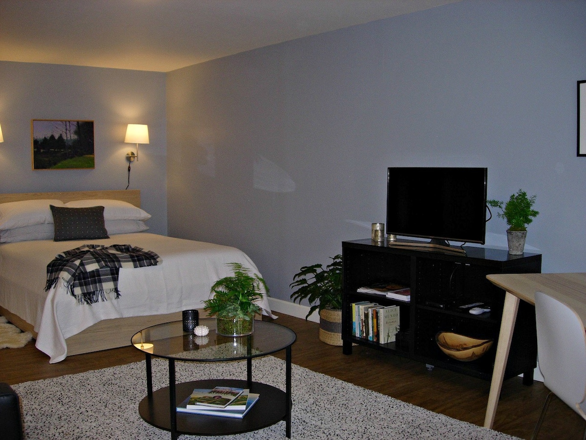 Set in the heart of Wine Enthusiast’s Wine Region of the Year, this newly renovated 2-bedroom, 800 sq/ft terrace level flat with separate entrance, is located in a private setting in the Keswick area. Close to Downtown Charlottesville, we are adjacent to Clifton Inn and Glenmore and minutes to Keswick Hall. After exploring many of Virginia’s wineries, breweries, and historical sites, kick your feet up between the trees in the hammock or share your adventures online with our high speed Wi-Fi.