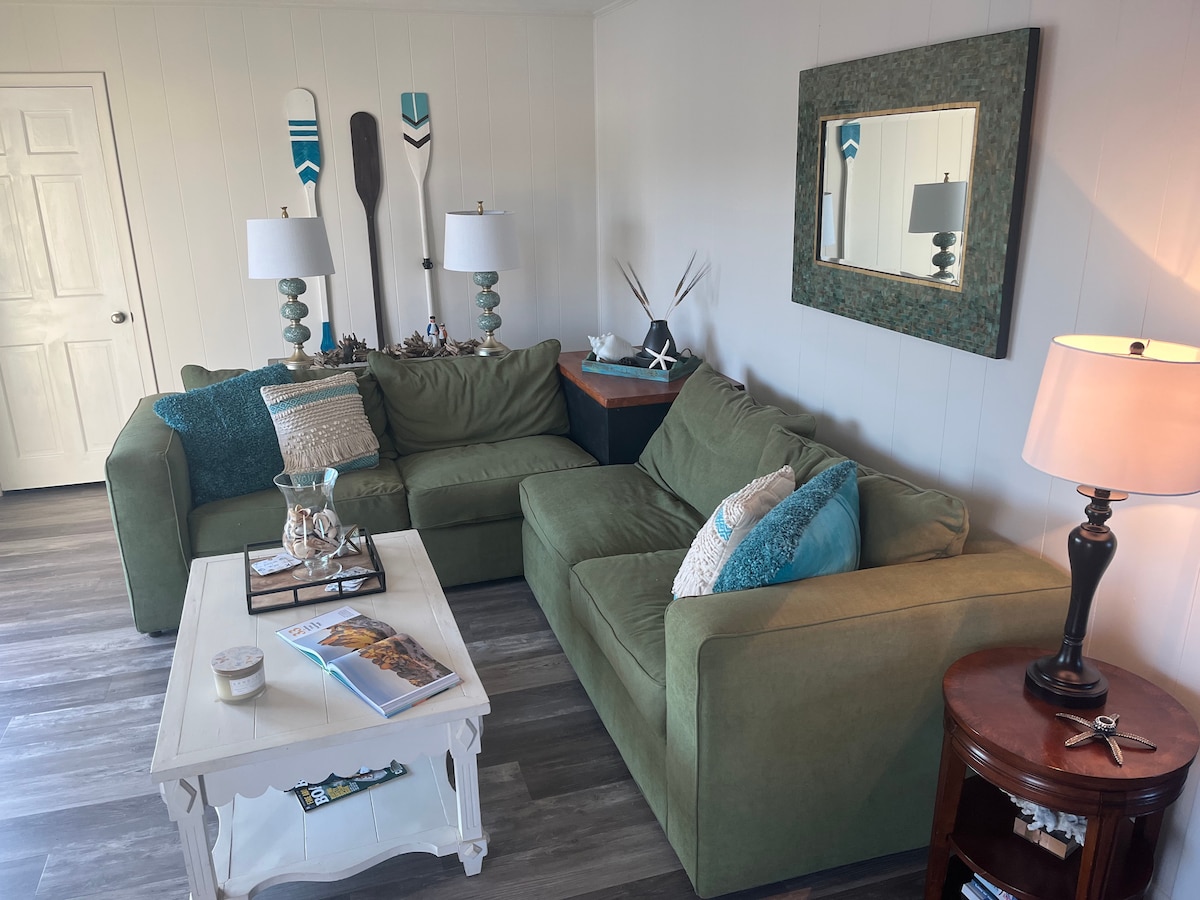 Luxury, Waterfront larger one bedroom, ground floor unit. This unit features beautiful lake views from a covered deck. Condo has been completely remodeled and features all NEW furniture, beautifully tiled ceramic shower with bench, chair height toilet, new kitchen cabinets, stainless steel appliances and everything in between. Updated HVAC, plumbing and all new electric throughout with LED lighting. The condo is equipped with 65 and 50 inch smart TV's, King size bed and sleeper sofa.