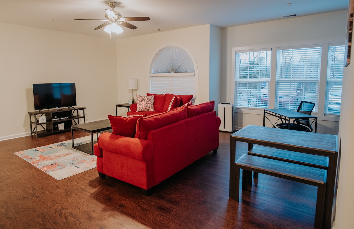 Escape to a peaceful, wooded retreat in this unique 2 bedroom/1 bath space nested under the hosts’ residence in Greensboro, NC. Enjoy a private driveway and entrance, and a covered porch with a swing. Ideal for work or play, the space features fast internet, a smart TV, a well appointed kitchenette, custom woodwork for a modern rustic feel, and a backyard with a fire pit for relaxing evenings. This tranquil hideaway offers space, comfort, and privacy in a quiet residential neighborhood.