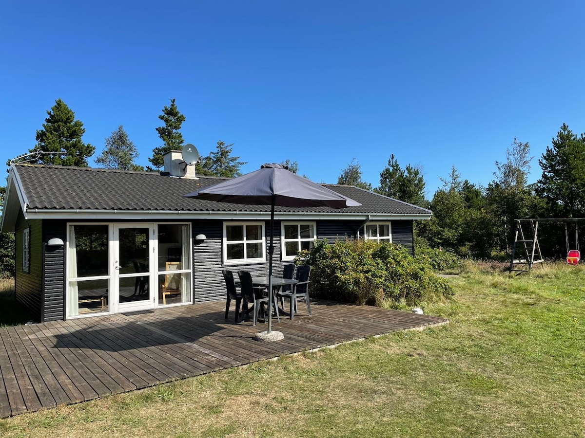 Få minutters gang fra det brusende Vesterhav ligger dette 120 m2 unikt beliggende sommerhus, gemt så godt væk i de høje klitter, at man kun kan ane det fra vejen. Fra grundens højeste klit er der bænk med udsigt til hav og solnedgang. Tag en kop kaffe eller et glas vin med derop. Der er blot 11 km i bil til badebyen Blokhus, 15 km til Løkken og endnu kortere via områdets stier til fods eller på cykel. Endvidere et fantastisk område, hvis man er til mountainbiking eller naturvandring.