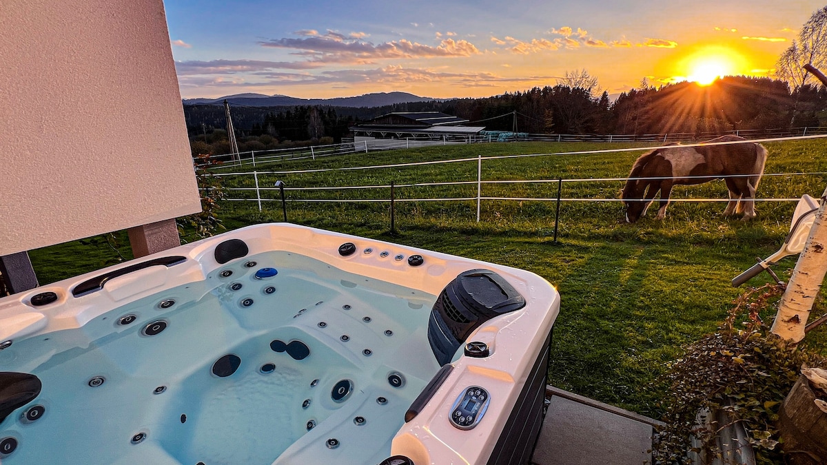 Experience the perfect blend of luxury and nature in our stunning mountain studio! Wake up to breathtaking views of majestic peaks and immerse yourself in the tranquility of unspoiled nature. Rejuvenate in our private infrared sauna and unwind in the outdoor hot tub on the covered terrace. In summer, enjoy a refreshing dip in the pool and the unique sight of zebras grazing peacefully just below the studio. A stay that promises peace, inspiration, and unforgettable memories awaits you.