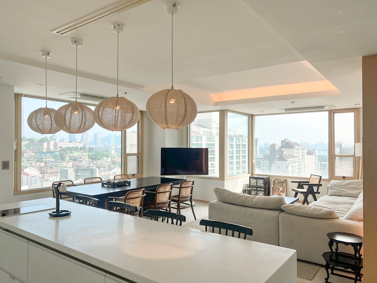 SEOUL SKYLINE from TOP FLOOR Panoramic Landmark : Hangang River, Seoul N Tower, and Lotte Tower On the Move: Walk 10 secs to Bongeunsa Station (Line 9), 10mins to Samseong Station (Line 2) From Airport: Take AREX and Line9, or Airport Bus Urban Essentials: COEX Shopping Mall, Grocery Shops nearby Cultural Connection: 5 mins to the historic Bongeun Temple (Oldest temple: Founded in 794) Design Touch: This place was designed and renovated by K-pop Star, Got7