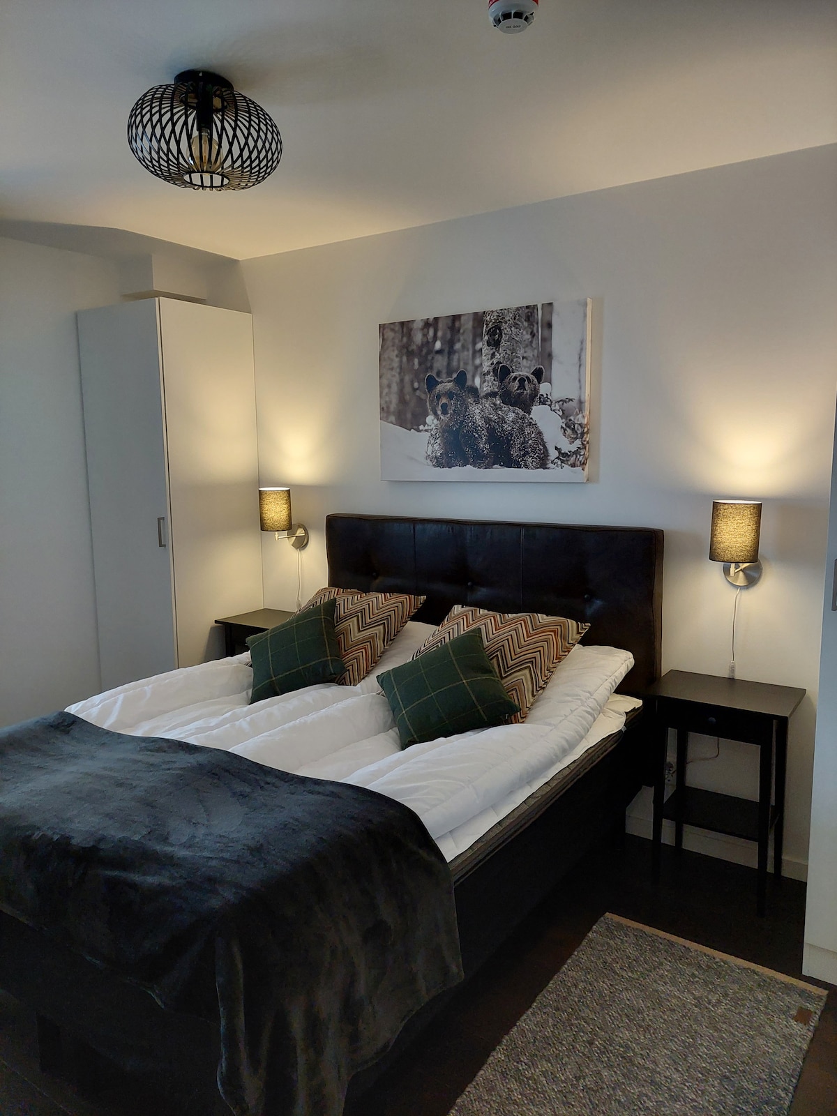 Åre Björnen: Rymlig och modern lägenhet om 90 m2 i bästa solläge (sydväst) med stora fönster ostörd utsikt mot Åredalen. Perfekt för den stora skidåkar/vandrarfamiljen. Njut efter en dag på fjället i det stora allrummet som har öppen spis, en väl tilltagen soffgrupp och inte minst ett stort träbord som alla kan samlas kring eller slå er ner ute på terrassen och njut av solnedgången över Åredalen. Efter kalla skiddagar ta en bastu i vår exklusiva nybyggda bastu.