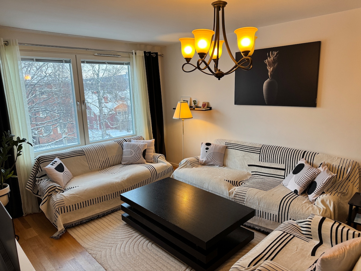 Nyrenoverad och smakfullt inredd lägenhet i sekelskifteshus. Här har du närhet till city, vackra naturstigar, skridskobana, skidspår på sjön. 10 minuters bilväg till flygplatsen och 2,5 km in till centrum via bil, cykel eller fina promenadstråk. Kostnad tillkommer för elbilsladdning (typ 2 kontakt 16A), handdukar och sängkläder. Städning utförs av hyresgäst innan utcheckning. Städutrustning finns att tillgå. Permantet boende värdfamilj bor på övervåning men har separat ingång. Väl mött.