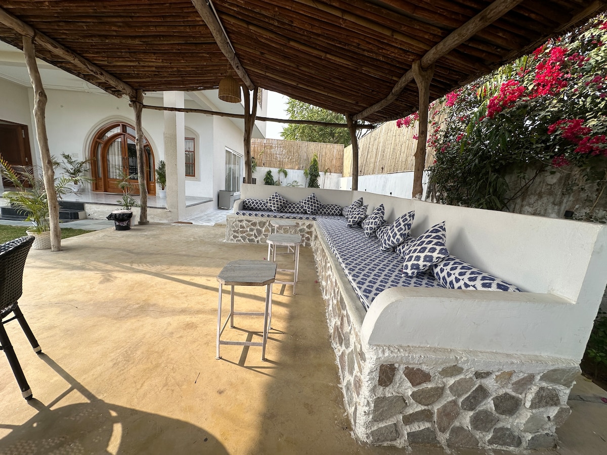◆Tucked at the foothills of Ramgarh Fort, this colonial-style villa offers a peaceful retreat surrounded by lush forest & hills! ◆A stone-paved walkway winds through a charming garden & leads to a private pool complete with an outdoor shower—perfect for refreshing dips. ◆Inside, the living room is furnished with a L-shaped sofa, a TV for movie nights & a fireplace for cooler evenings. ◆A cosy balcony with a swing provides a peaceful corner to enjoy the quiet while soaking in the scenic views.