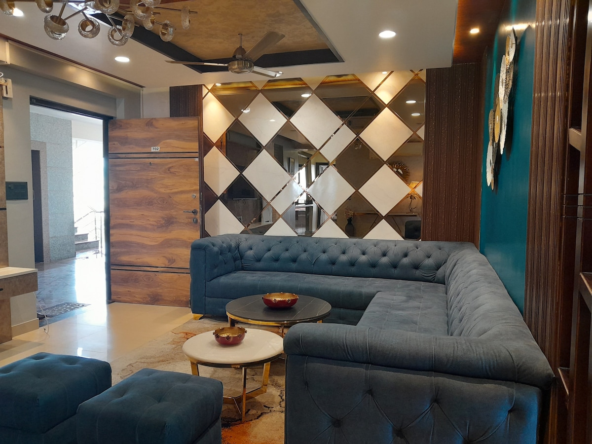 A centrally located modern 3BHK apartment designed for comfort and style, perfect for families or groups of up to 10 guests. Situated on the 7th floor, it offers airy, well-lit spaces with attached bathrooms in every bedroom. Enjoy a private balcony with beautiful city views, especially at night. Equipped with all essential amenities, this home promises a relaxing, luxurious stay and a memorable Jaipur experience.