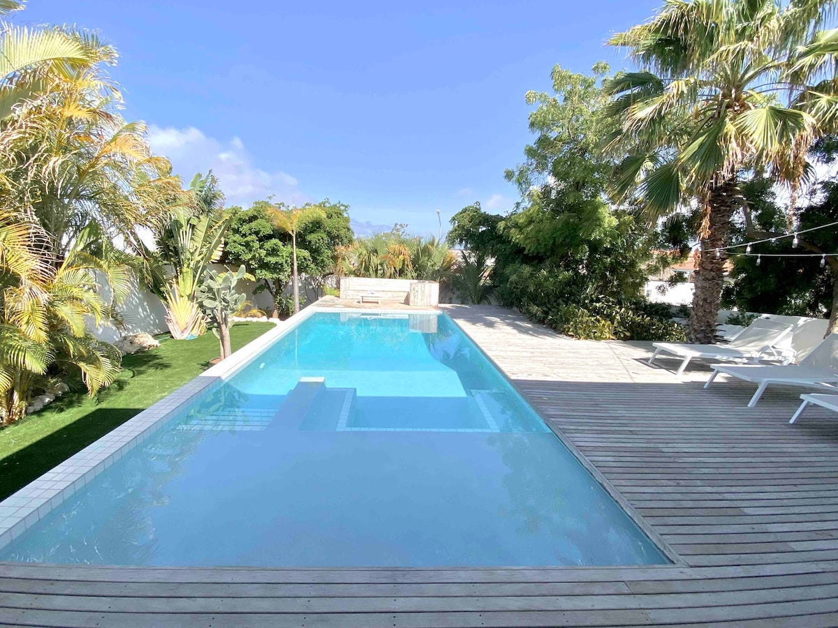Spacious modern apartment in prime location, enjoy the short 7 minute walk to the beautiful beach, bars and restaurants. The apartment is totally private with your own entrance, living room, bathroom, bed room with AC, kitchen and balcony. The apartment is equipped with a new comfortable bed and a luxurious (sleeper) sofa. The balcony and garden invite you to sit down, take a swim or have a glass of wine whilst watching your favorite Netflix series on the Smart LED TV in the living room.