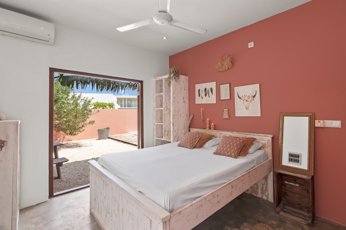 Our modern and luxurious 1-bedroom bungalow, just a 5-minute drive from Jan Thiel Beach, offers everything for a relaxing stay. The space is designed in a stylish Ibiza theme and features a spacious bedroom with a king-size box spring, a luxurious en suite bathroom, and a fully equipped kitchen. Unwind in the peaceful garden with a palapa and privat plunge pool. The quiet location, combined with every possible comfort, makes this the perfect place to enjoy Curaçao.