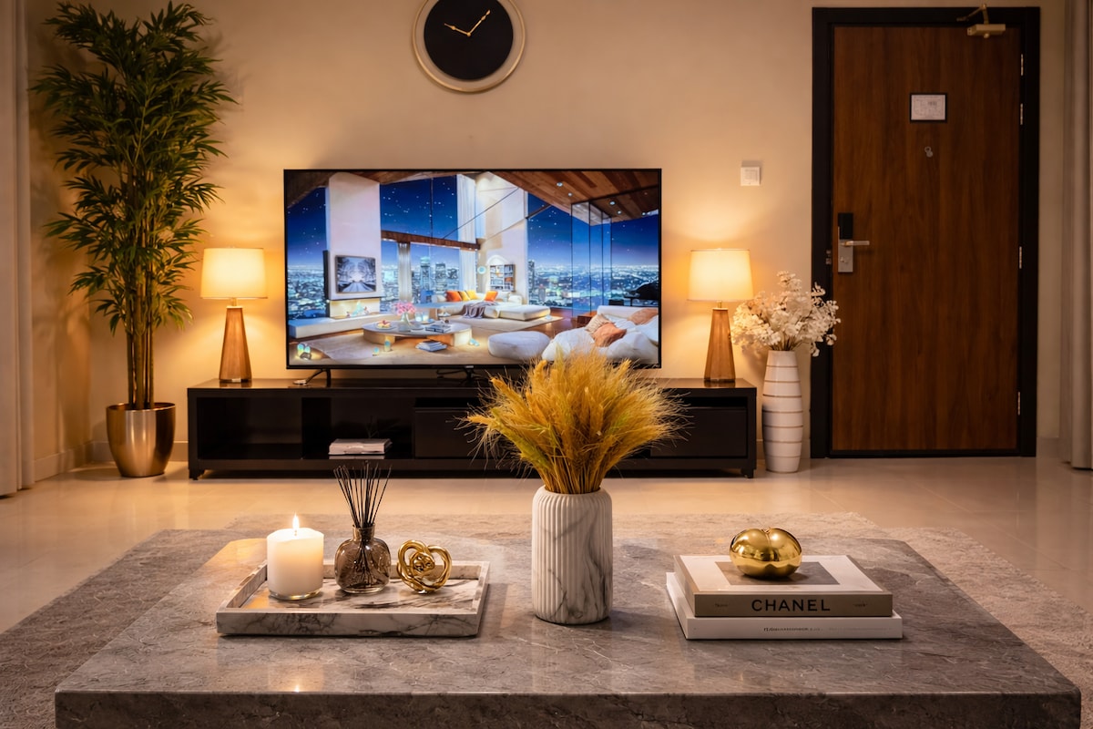 Forget your worries in this spacious and serene space. New apartment on 3rd floor with private lift access. 2 bedrooms, 2 bathrooms, living room, kitchen and laundry room. Large screen TV + hifi sound system with streaming channels. Host staying in same building and available anytime to make your stay memorable.