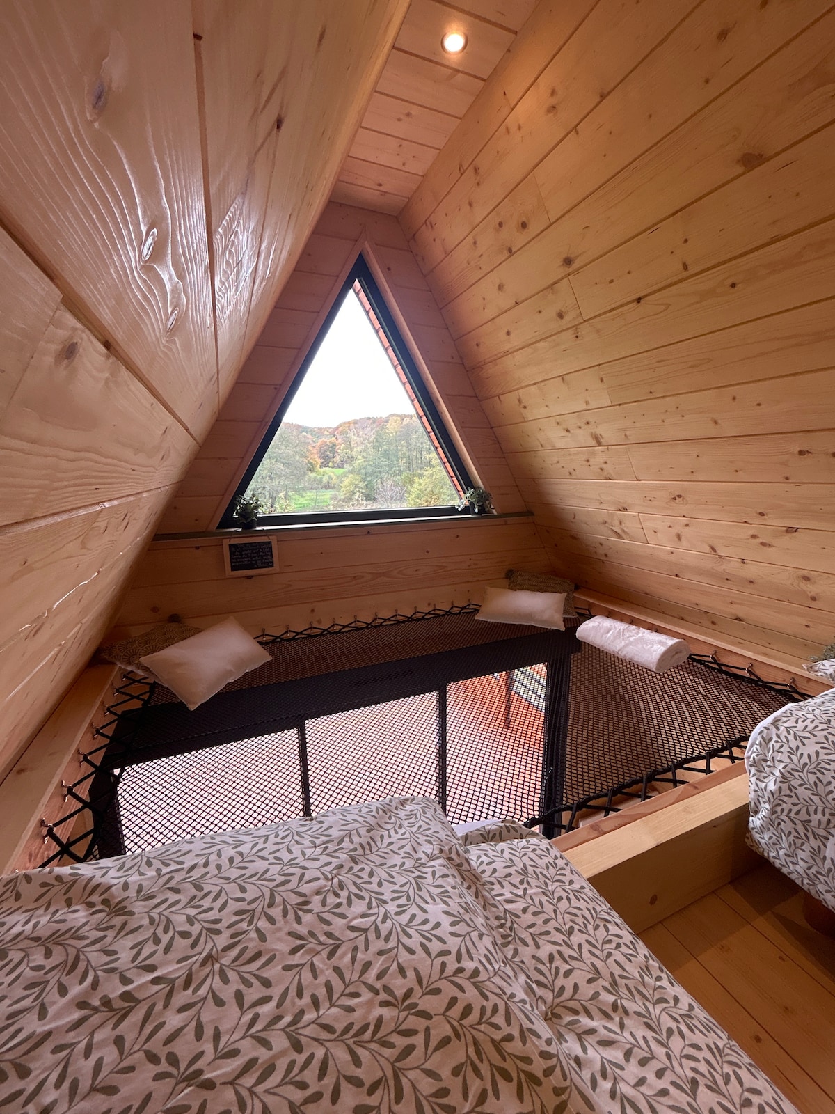 Détendez-vous dans cette maison en A avec une tranquillité adaptée à la famille. Ce cocon est prévu pour 6 personnes avec une chambre fermée et un lit en 160. Sur la mezzanine deux lits simples en 90. Dans le salon un canapé convertible en 140 où vous trouverez couette et oreillers dans le coffre de celui-ci. Vous pouvez profitez des étoiles ou d’un repos avec le filet de détente à ne pas confondre avec un trampoline😉.