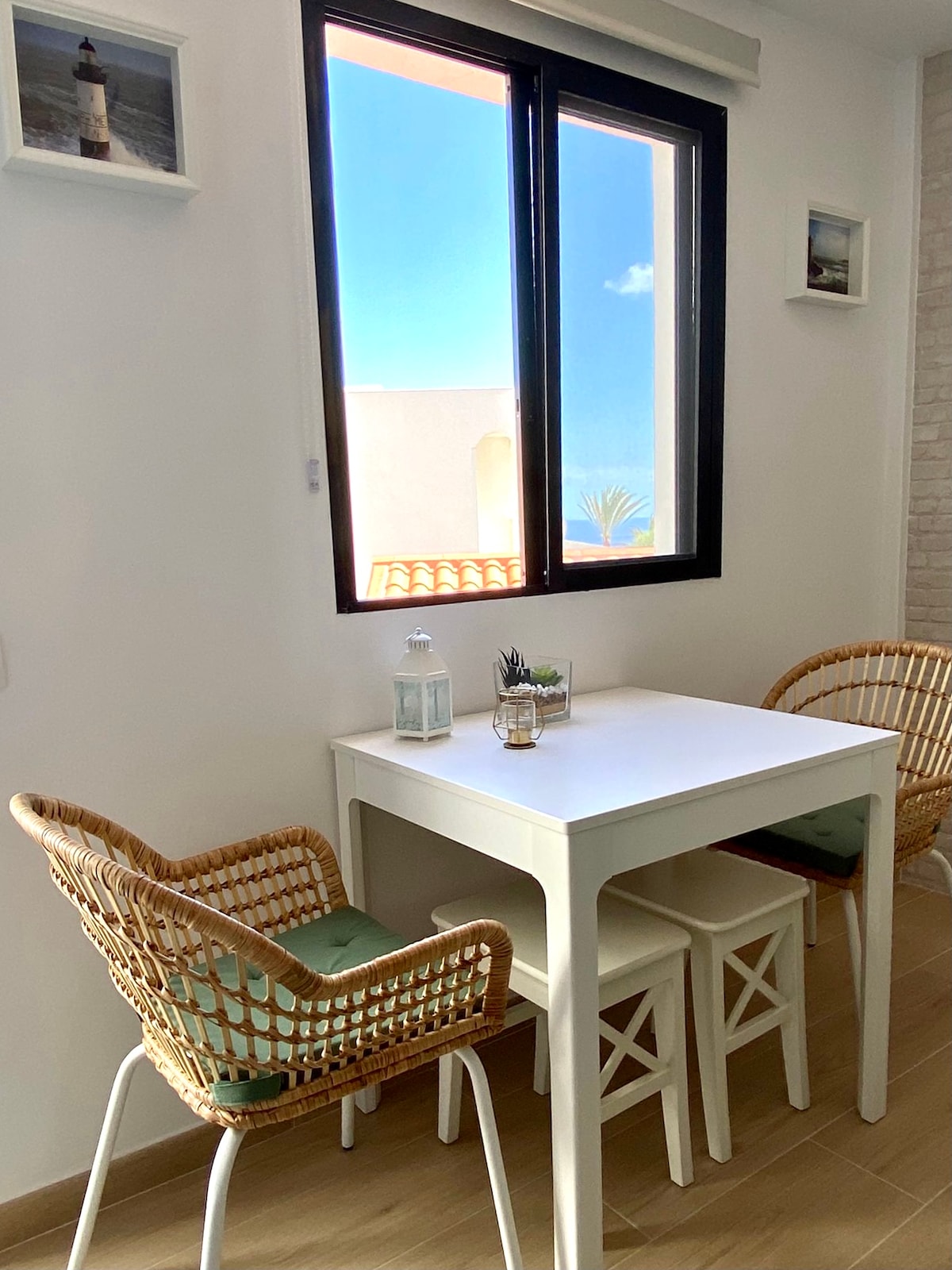 Precioso apartamento recientemente reformado con maravillosas vistas al mar desde la terraza y desde el dormitorio principal. Localización ideal, a tan solo 5 minutos caminando de la fantástica playa de Morro Jable, del centro del pueblo y de todos los servicios y restaurantes cercanos.