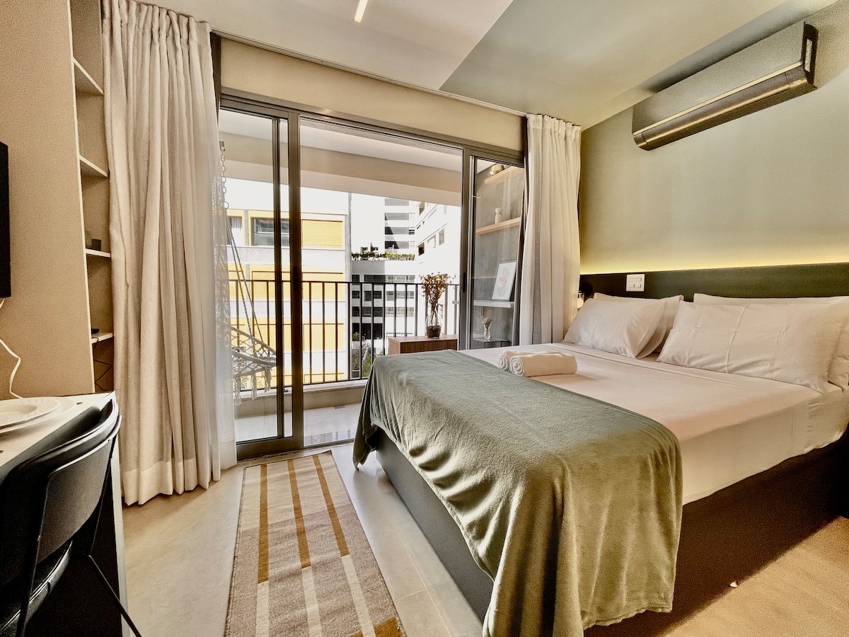 Relax in the best location of São Paulo, between Jardins and Pinheiros. This newly opened studio is a 5-minute walk to the Oscar Freire subway station, in a new building with all the infrastructure for a quiet and comfortable stay. It is on top of a bakery with artisan bread and across the street from a supermarket. The building has coworking and coliving space, laundry room, gym, rooftop pool, and a 24-hour doorkeeper. Wi-Fi 450Mbps.