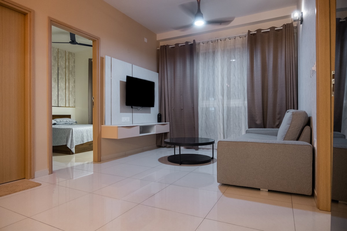 Luxury 2BHK with sweeping farm views and a rare front-row seat to Bangalore Airport’s takeoffs and landings. Clear skies, peaceful surroundings, and a cinematic balcony view you’ll remember. Just 10 minutes from the terminal and right off the highway, making it perfect for quick transits, early flights, business trips, or a quiet getaway. Modern interiors, great light, and the ideal mix of calm and convenience.