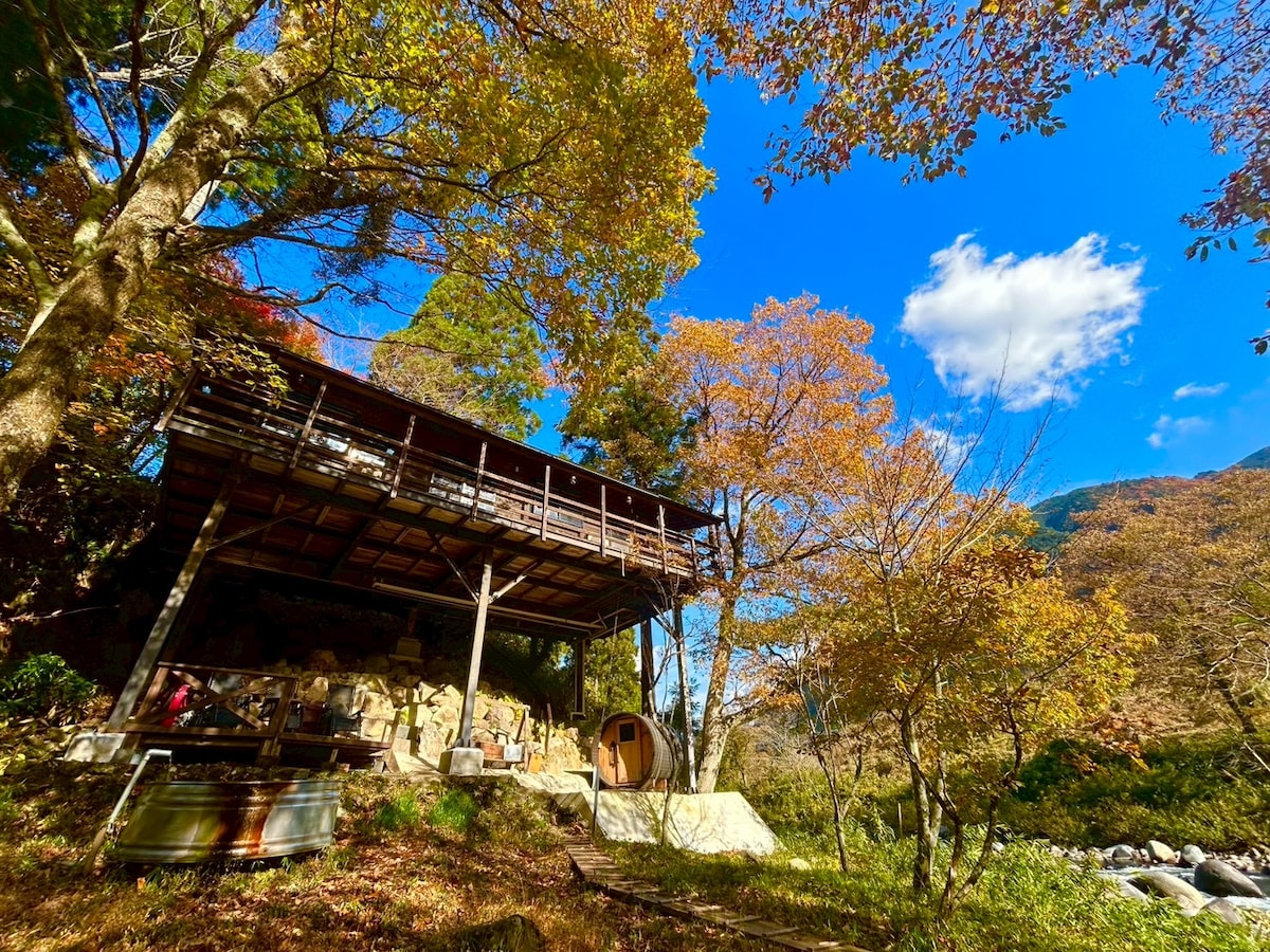 A cute triangular-roofed tree house can be seen as you climb the hill! The facility is located high above the ground with a great view and a pleasant breeze. You can also enjoy BBQ and swings. Private shower facilities available! *There are no fences attached to the deck or other areas. Please do not let children out of your sight. *It is a short walk up a steep hill, so it can be slippery after rain. In case of rain, we recommend that the tour be rescheduled.