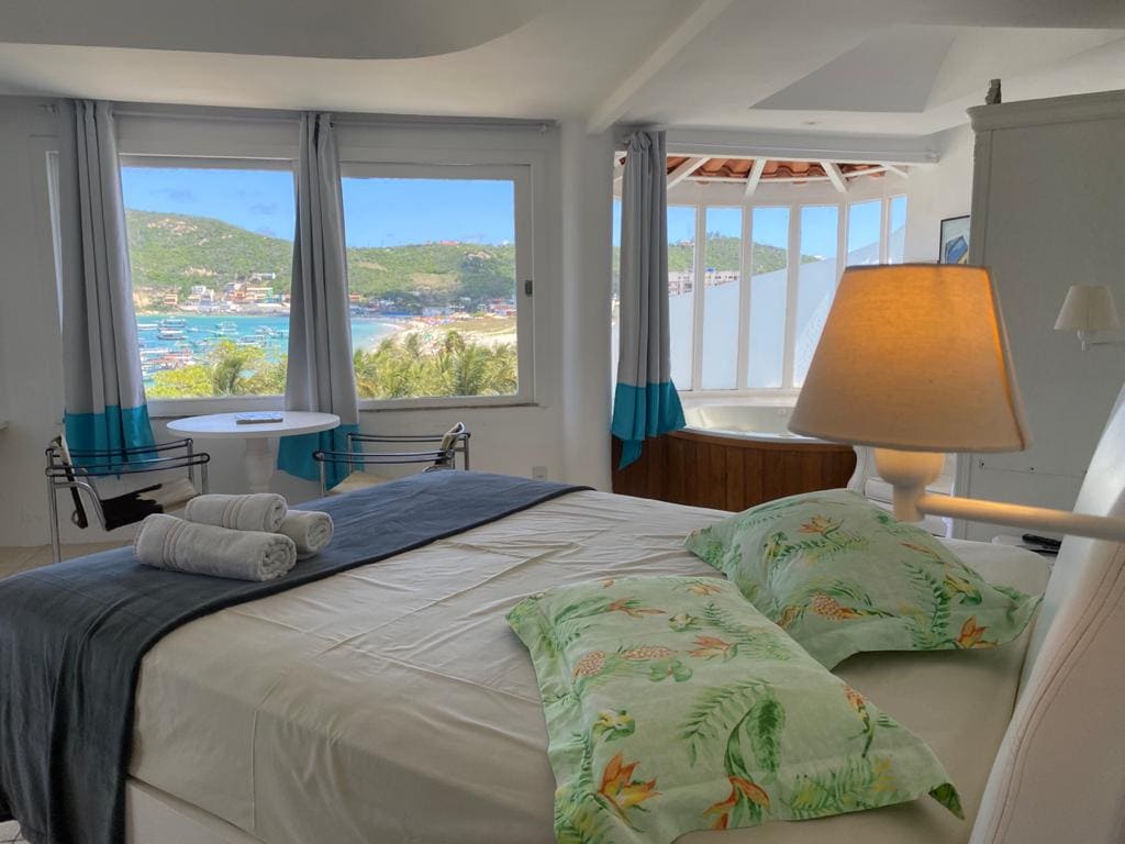 Situada na estrada principal de Búzios, esta luxuosa pousada oferece 3 suítes com cerca de 85m² cada, com quarto, sala, closet e banheiro com banheira, chuveiro duplo, pia e vaso sanitário. Cada quarto inclui uma cama king size, mesas de cabeceira, televisão, sofá, mesa e cadeiras. Os quartos também estão equipados com Wi-Fi e controles Alexa. O alojamento dispõe de área de recepção, sala de estar, sala de jantar e cozinha. Há também uma grande piscina, e churrasqueira.