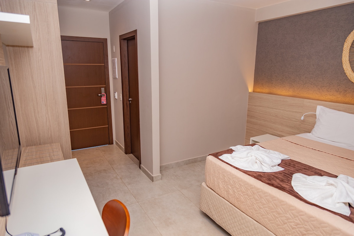 tudo novo! cofre,espelhos,roupas de cama de alto padrão ,finamente decorada acomoda casal ou 2 solteiros e tem uma cama auxiliar. as dependências do hotel são ótimas com restaurante, bar,piscina, sauna academia e agora com estacionamento grátis a disposição. colocamos na TV um cabo HDMI conectado para seu notebook ou streaming ,no frigobartem bebidas que pode ser pagas no QR code e o mesmo para o cafe expresso!.. estacionamento grátis dentro do hotel. faremos de tudo para sua estadia ser top!