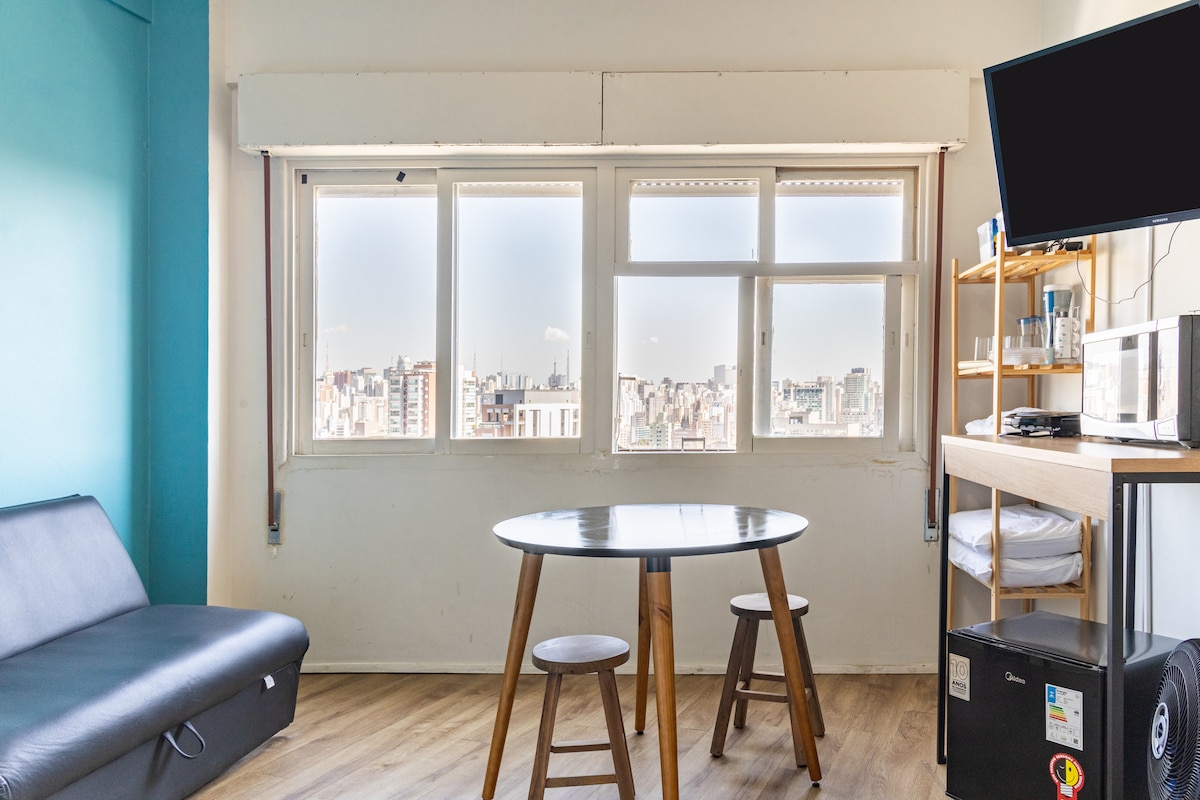 O studio fica no 31º andar do edifício mais alto do centro, com um design moderno e acolhedor, além de uma vista impressionante da cidade. Da janela, é possível admirar o Vale do Anhangabaú, Centro Histórico, as antenas da Av. Paulista: uma das paisagens mais belas de SP. É o prédio onde fica o SampaSky e é possível caminhar para as principais atrações do centro. Conta com ar condicionado, TV de 55'' com apps, cozinha equipada com utensílios básicos, cooktop (1 boca), microondas e frigobar.
