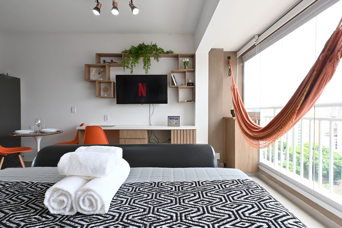 Estúdio funcional (cozinha completa) bem localizado na Liberdade próximo a Av. Paulista e Av. 23 de maio, além de faculdades, hospitais, farmácias, metrô e estacionamentos. Curta essa experiência em um espaço equipado com acomodação para até quatro pessoas, com grande conforto ar quente/frio . Você poderá ainda usufruir de uma bela vista, relaxar na Jacuzzi além de bela área de convivência. O condomínio oferece também coworking, academia e lavanderia.