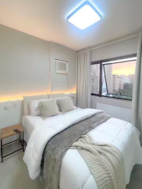 Experience One Eleven in Vila Olimpia. This modern apartment features large windows with breathtaking city views and natural light. The unit boasts 600 Mbps internet and a 4K HD TV. For total comfort, it has a Hot/Cold AC system: 27,000 BTU/h unit in the living room and 10,000 BTU/h in the bedroom. The bedroom is quiet and dark for a restful sleep. Impeccably maintained, you’ll be walking distance to top restaurants and business hubs—a safe, upscale retreat with a stunning urban backdrop.