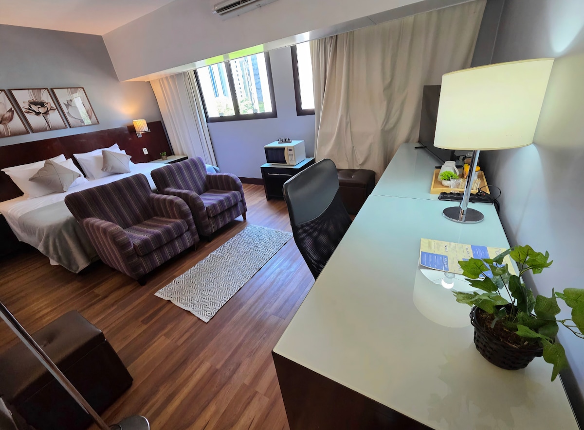 Flat with mini-kitchen in the best location in São Paulo, one block from Av. Paulista, 450m from Trianon Masp station. High-speed Internet in the apartment itself (besides the hotel internet) and a good place to work. Beautiful 65 INCH TV. 1 King Size bed OR 2 Single beds, just let us know. It is in a 4-star hotel with an excellent gym and sauna included in the rate. With iron and ironing board. A garage included. - 2 restaurants, one on the rooftop (terrace), with a beautiful view of the city.