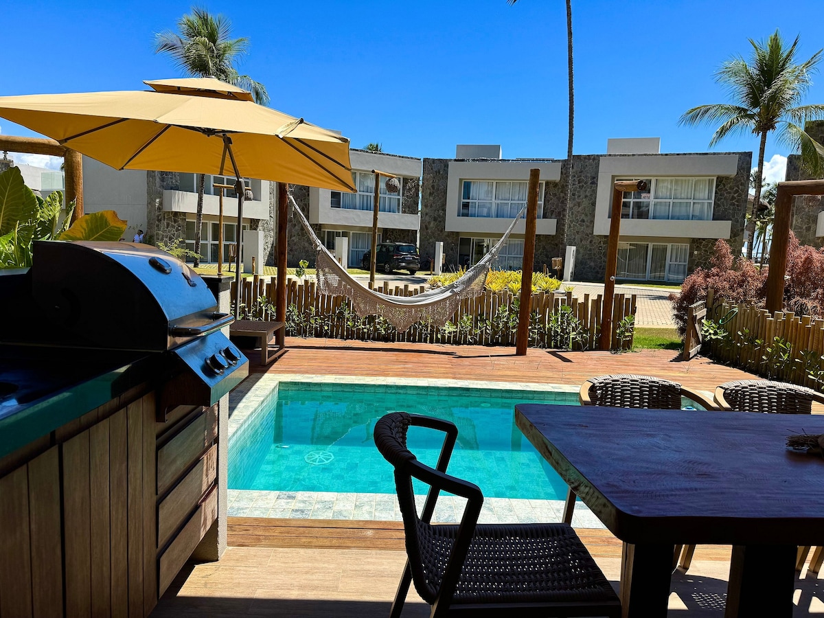 House in a beachfront condominium on stunning Marceneiro Beach, part of the Ecological Route of Miracles/AL. It has 2 suites and 1 bedroom with an accessible bathroom. Air conditioning in all rooms. Fully equipped for a comfortable stay: complete kitchen, linens, Smart TVs, fiber internet, private pool, and 2 parking spaces. The condominium offers a playground, beach access, gym, 24h security, laundry, and a beachfront common area.