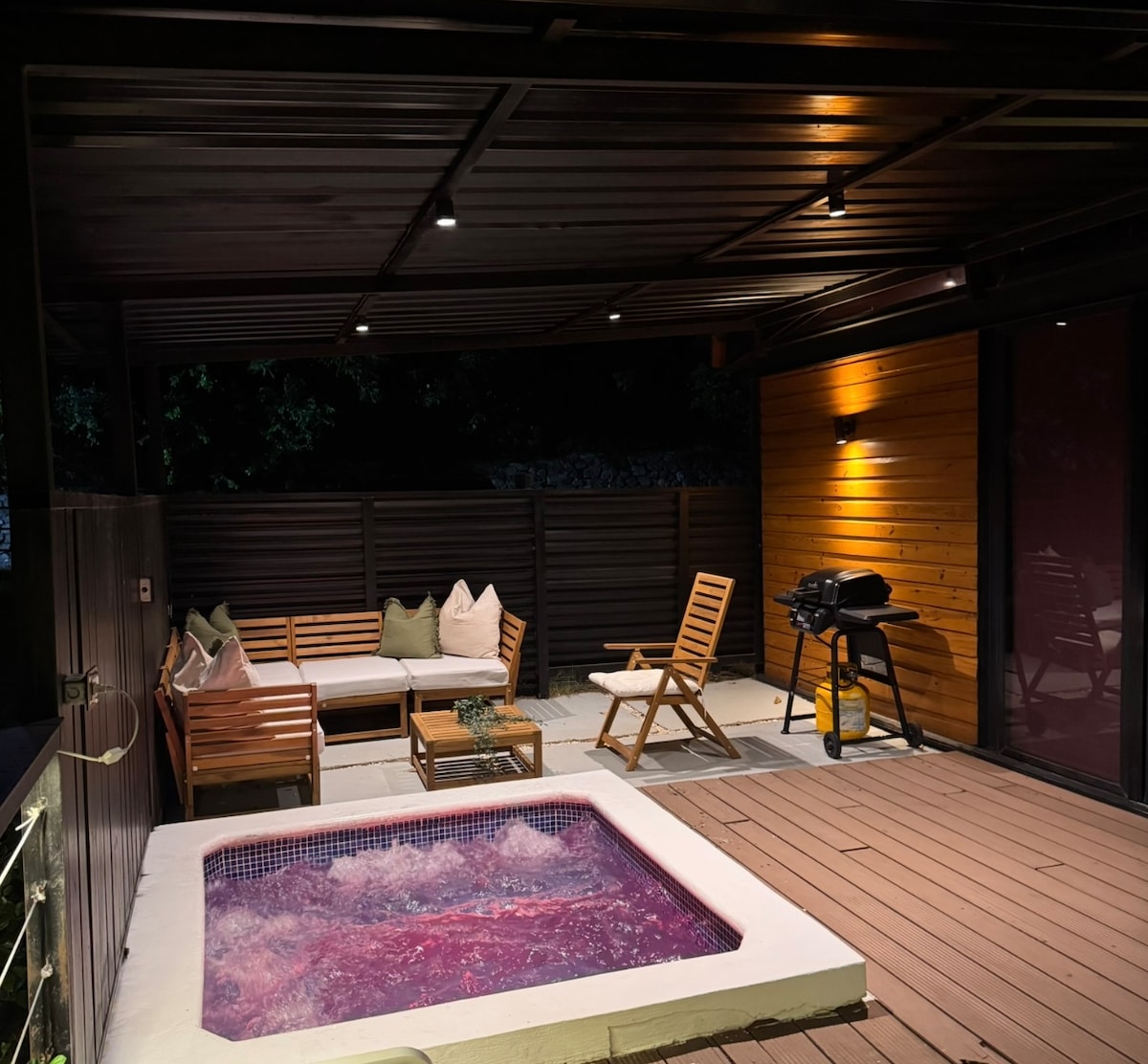 Your house, with just under 50 m², is located at the edge of our property, surrounded by plenty of greenery. It has 3 rooms with up to 5 sleeping places. YOU HAVE YOUR OWN PRIVATE POOL! The house offers all the comforts, including a flatscreen TV, a music speaker, and of course excellent Wi-Fi. On the large covered terrace, you’ll find a nice gas grill. There is also a fire pit and a jacuzzi, although the jacuzzi is currently not working and not heated.