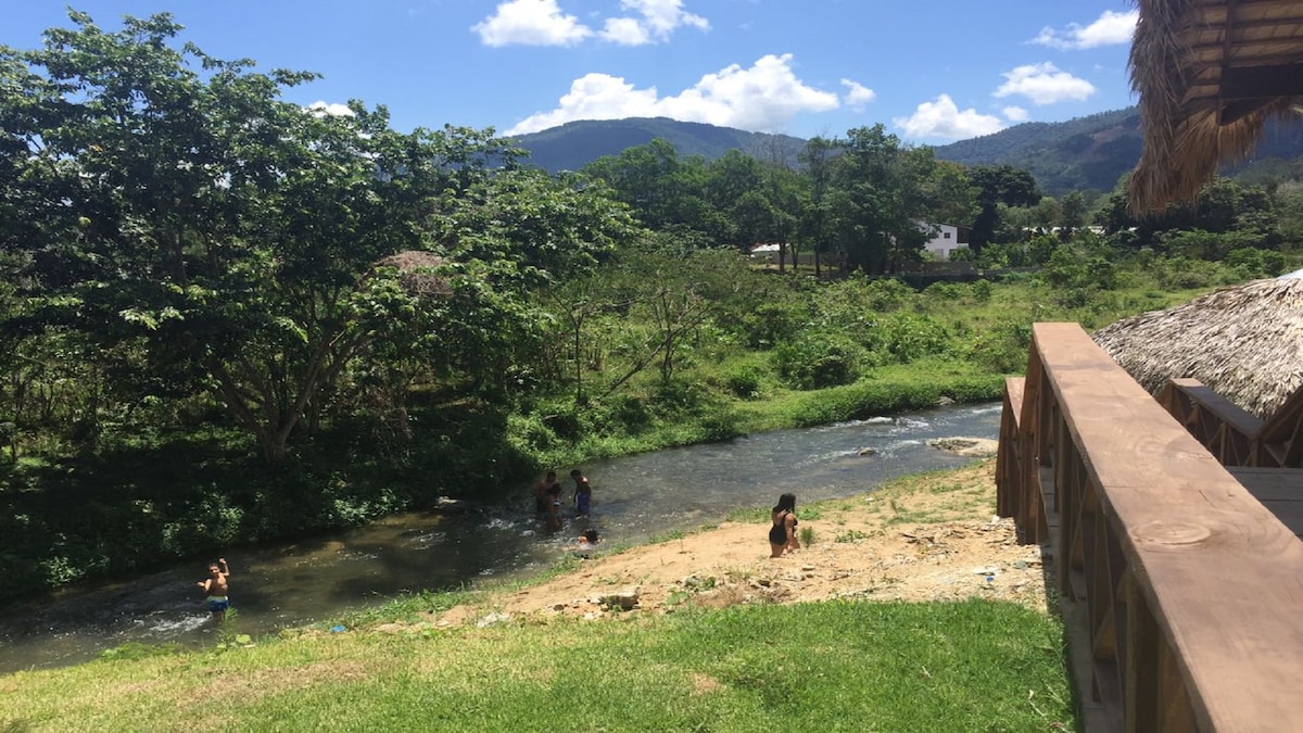 ALQUILER MENSUAL ¡Bienvenidos a nuestra encantadora casa rústica en Estancias del Río! Situada junto al río Jimenoa y cerca del centro de Jarabacoa, pudiendo acceder fácilmente a restaurantes, tiendas y atracciones locales. Ubicada en una urbanización privada, nuestra casa de invitados ofrece tranquilidad y seguridad. El segundo piso cuenta con sala de estar, balcón con vistas al río y cocina al aire libre. Dos habitaciones dobles independientes, con cómodas camas, y un baño completo.