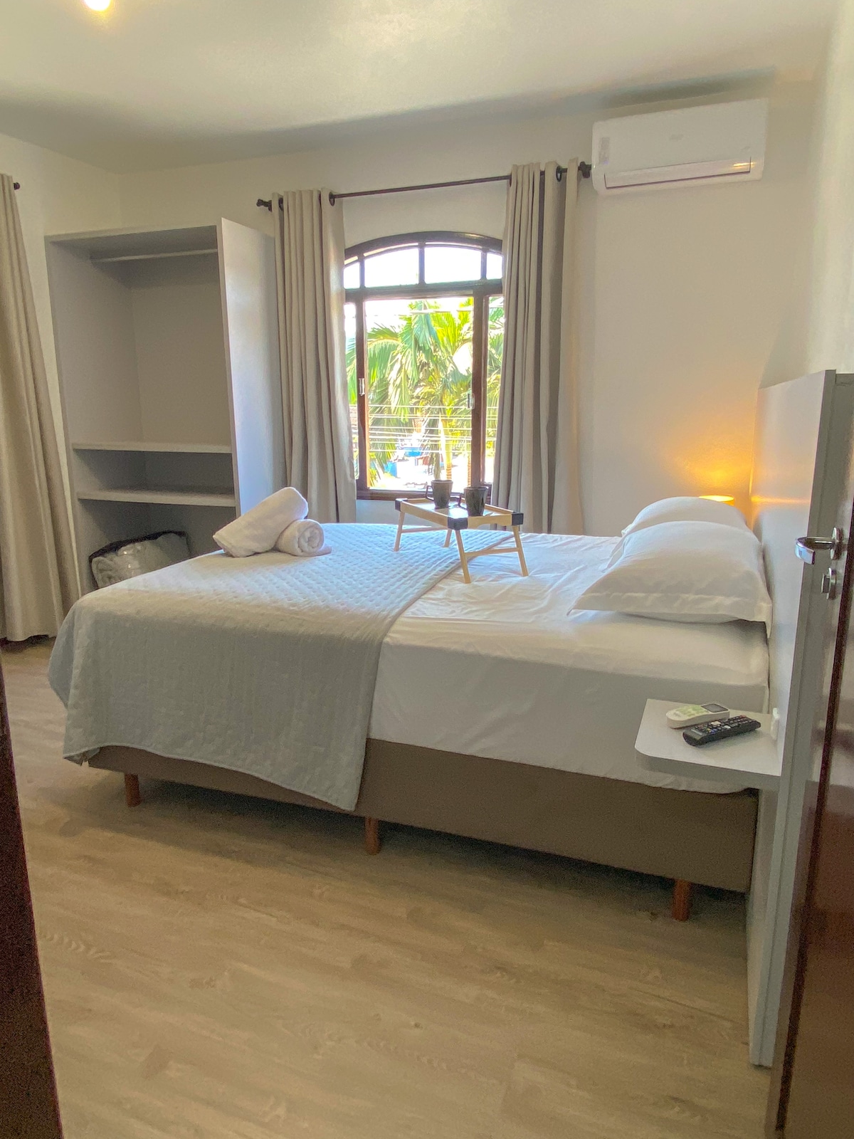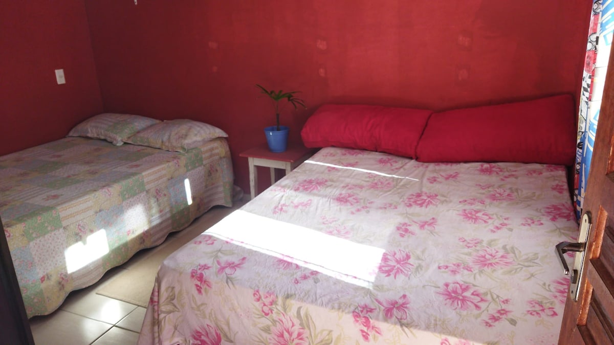 Você tem a seu dispor suíte com cama de casal e 2 beliches com ar-condicionado, com banheiro privativo e uma varanda.