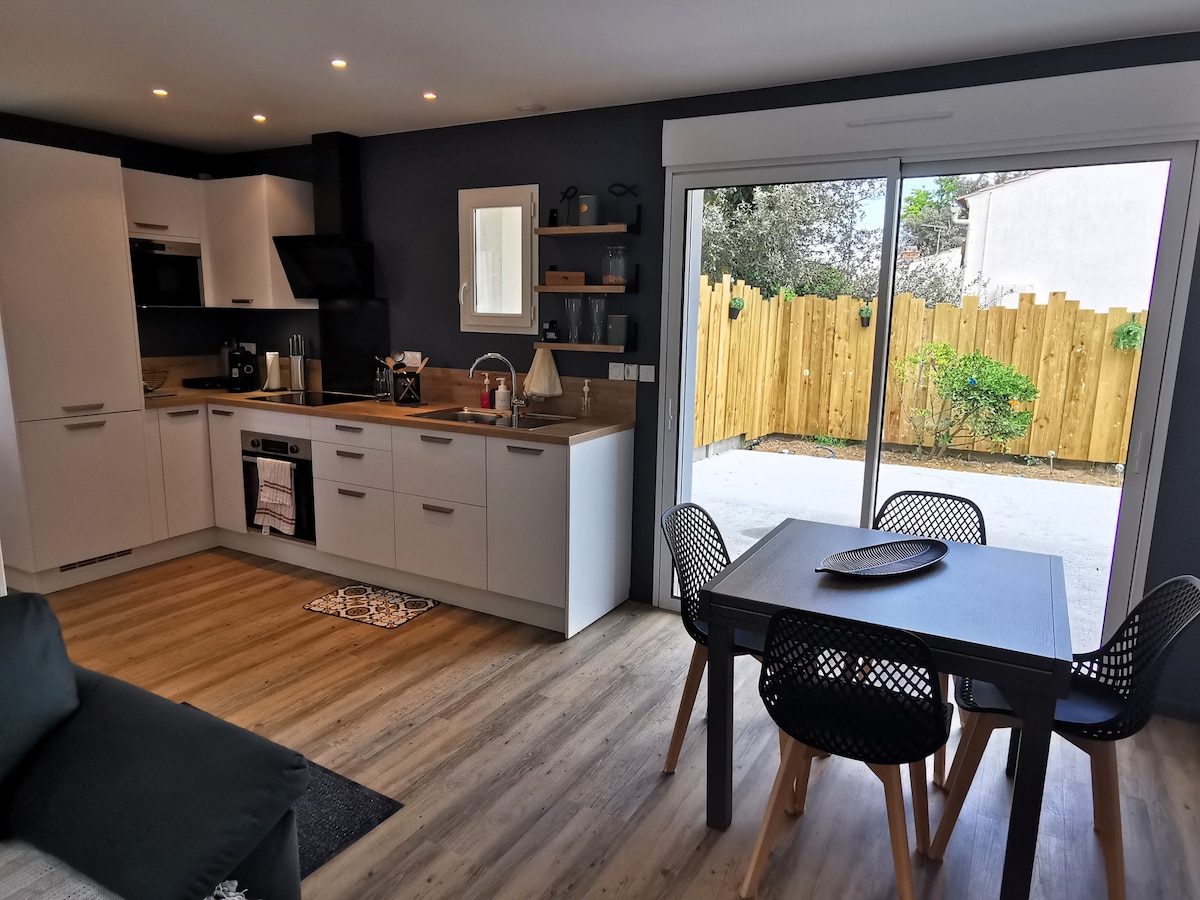 Je mets à disposition des voyageurs une maisonnette attenante à ma résidence principale. L'accès par un portail est commun. L'entrée privative vous donne accès à la maisonnette. La propriété se trouve dans le bourg de Jard Sur Mer. Vous avez accès à tous les commerces à moins de 100 mètres. La plage se trouve à 1 km. Vous pourrez prendre vos repas et faire de longues siestes à l'exterieur à l'abri des regards Table de jardin chaises et barbecue sont à votre disposition