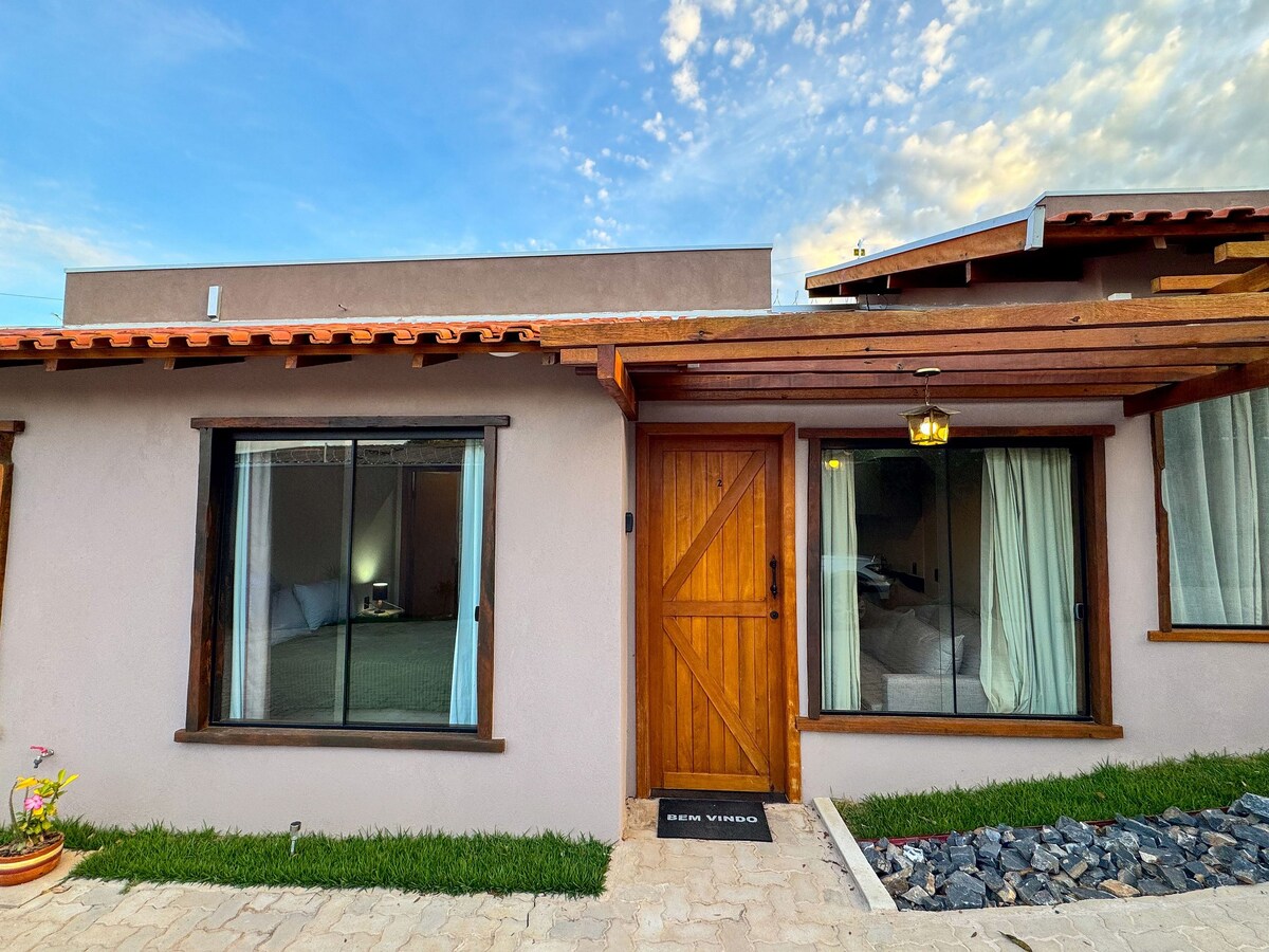 Casa em condomínio à 5 quadras do centro de Bonito. Além dos quartos com ar condicionado, possui um banheiro e uma sala-cozinha com sofá-cama, mesa, TV e ventiladores de teto. A cozinha possui fogão, geladeira, microondas, forninho elétrico, cafeteira e demais utensílios. Dispõe de Wi-Fi, opção de rede de deitar junto a entrada da casa, além de vaga de garagem. Possui ainda lavanderia com tanque e máquina de lavar roupas, junto a quintal privativo com churrasqueira portátil e bancos ao ar livre.