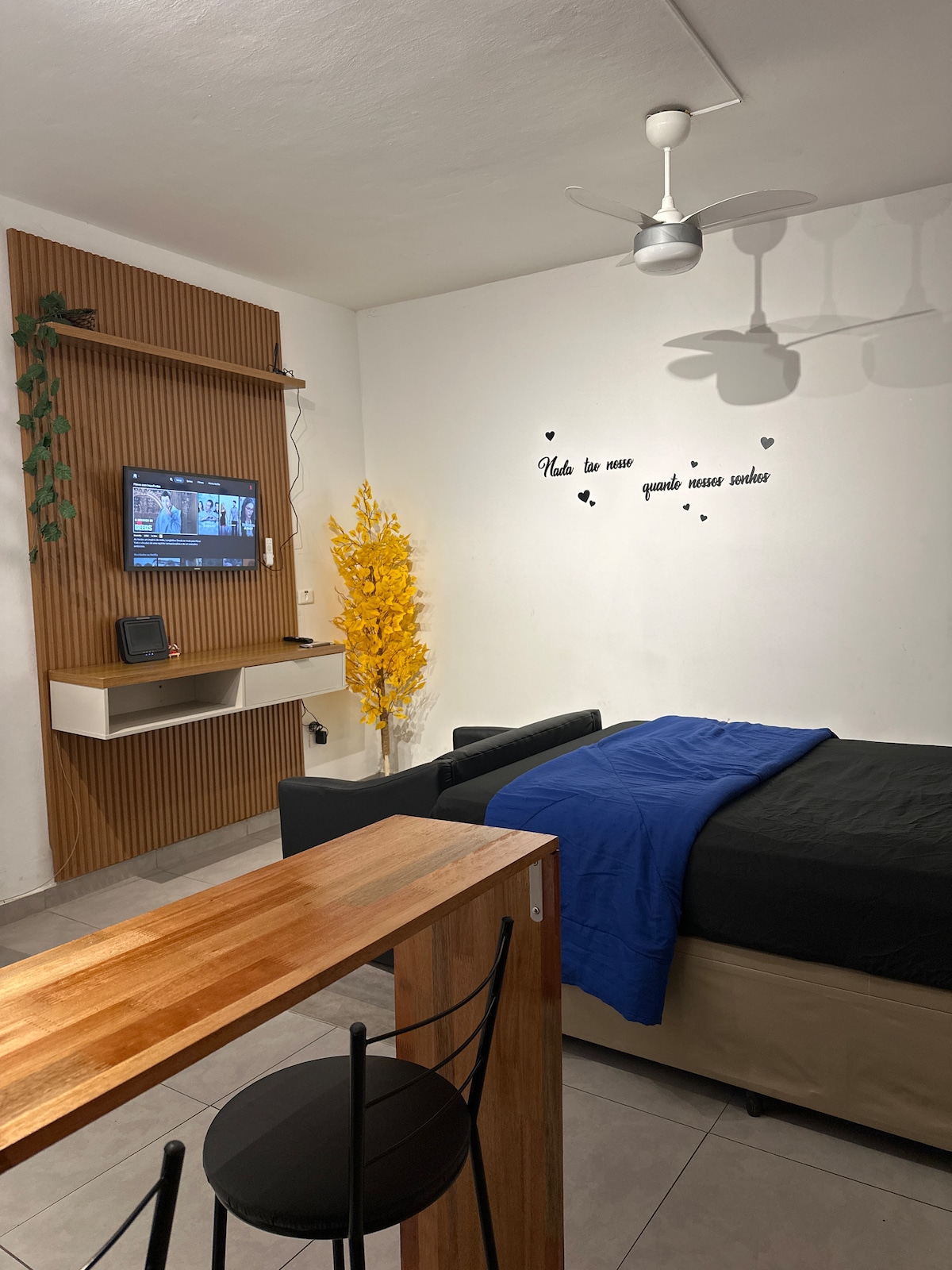 Studio aconchegante e completo, a poucos passos do metrô Guilhermina, e a poucos minutos do Neo Química Arena. Espaço ideal para até 2 pessoas, com cama de casal confortável, cozinha equipada, banheiro e uma área de trabalho com wi-fi rápido para quem precisa trabalhar remotamente. O espaço é limpo, bem iluminado, seguro e silencioso, ideal para viajantes, estudantes ou profissionais em trânsito por SP com fácil acesso ao Centro/ZL. Inclui: roupa de cama, toalhas, wi-fi, TV smart com Roku TV.