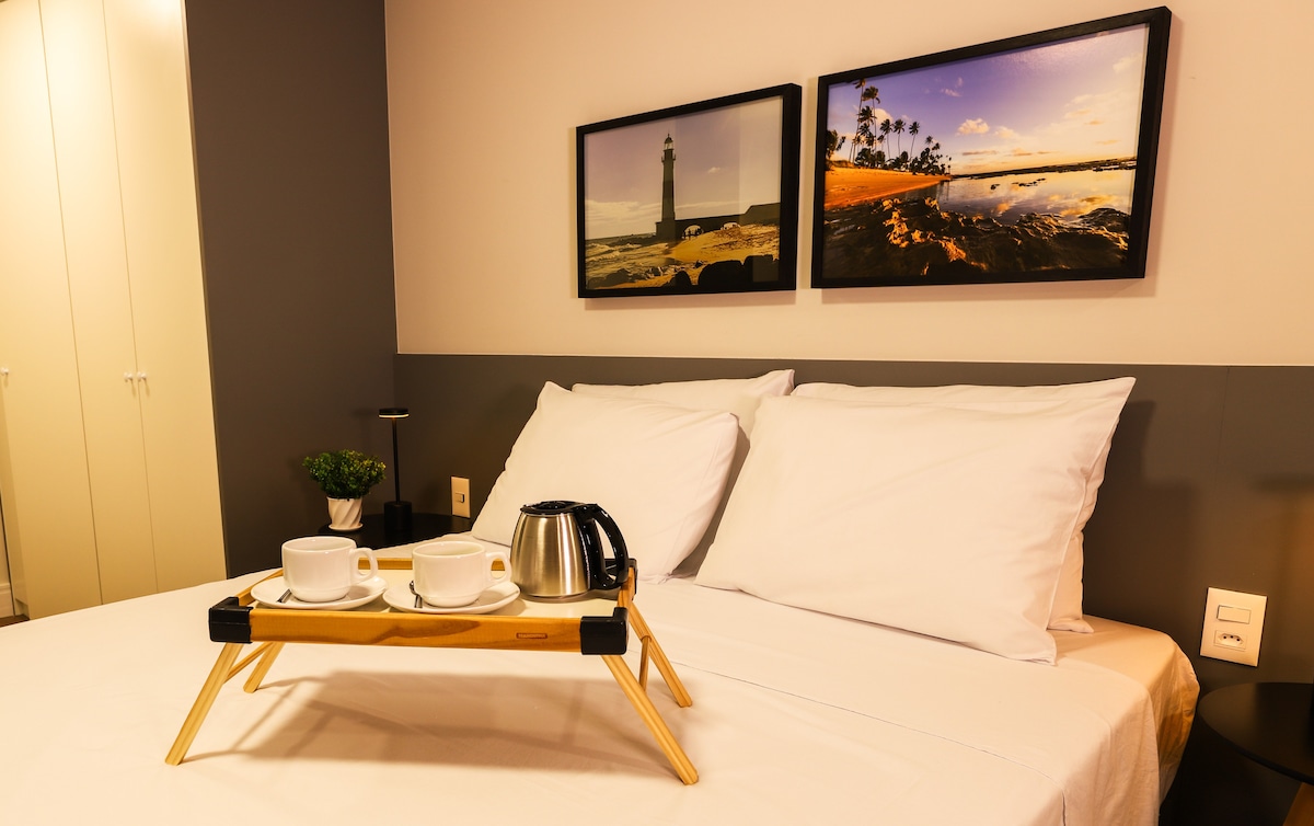 Comece o dia com um café da manhã na varanda ensolarada. Do outro lado da rua estão as areias da Praia de Armação e o Jardim de Alah, o jardim mais famoso de Salvador. O Centro de Convenções está a minutos. Seu refúgio à beira-mar inclui: - Ar condicionado - Cama queen size - Wi-Fi ultrarrápido - Garagem - Recepção 24h - Academia - Piscina semiolímpica - Serviço de camareira Viva uma conexão autêntica com a Bahia. Reserve agora e transforme dias comuns em memórias douradas!