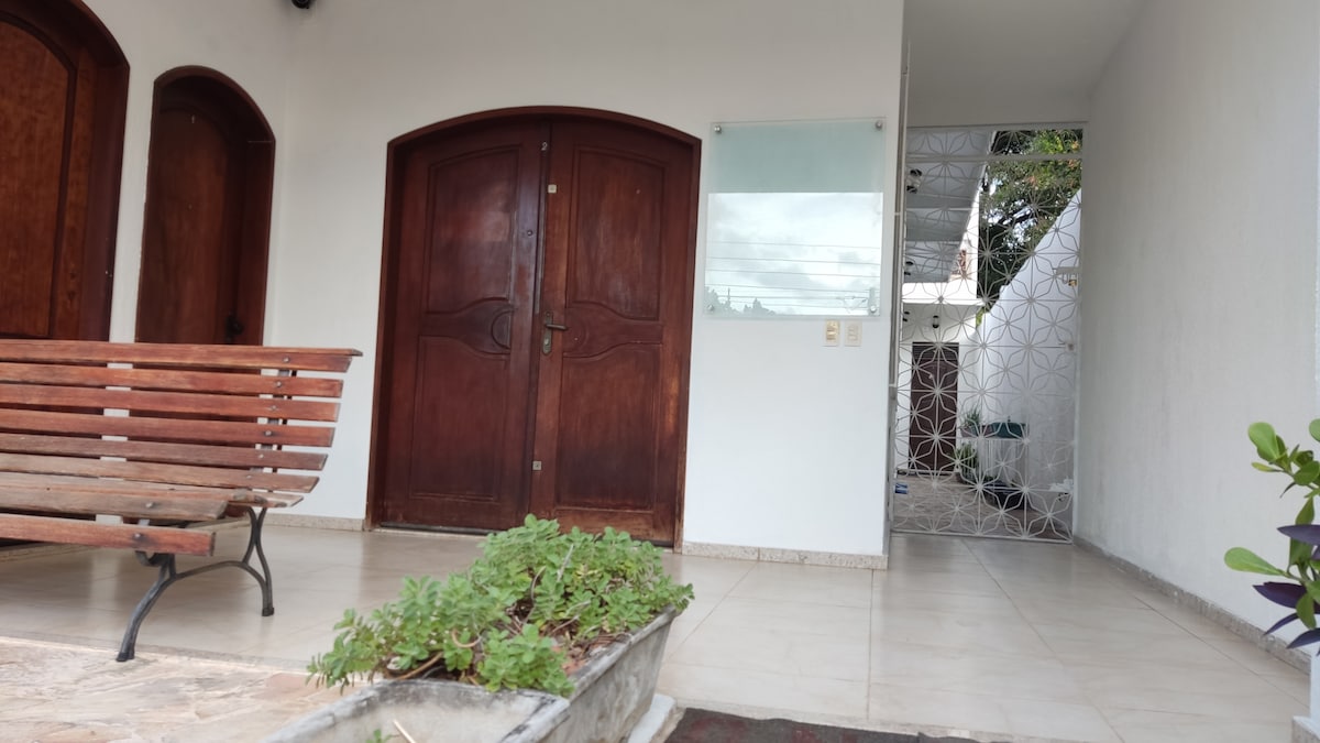 É um primeiro andar de uma casa familiar. O ambiente não oferece cozinha. Ele é um ambiente independente da casa. Só possui dentro da suíte: camas, um banheiro e uma geladeira conforme tem nas fotos. Não é permitido acesso a casa principal e não oferecemos nenhum tipo de serviço (cozinha). Possui: Wi-Fi, garagem coberta para um carro, banheiro privativo, geladeira e ventilador. Para acomodação de 5 hóspedes, teremos disponíveis 1 cama de casal, 1 cama de solteiro e colchões (podendo ser rede)