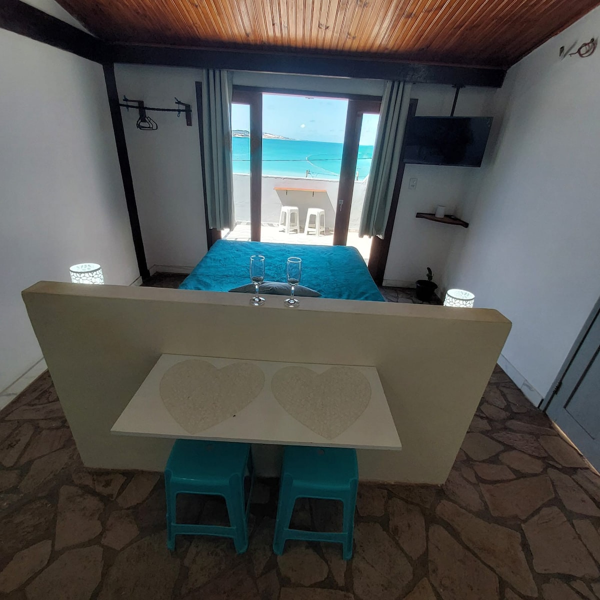 Apartamento único com vista total do mar, propriedade com a cesso a praia e além de uma ótima piscina para adultos e crianças com Decker de madeira que dá visão para o morro do careca , ar apenas no Quarto, geladeira , forno , fogão, liquidificador, ferro passar , Tv a Cabo , wi-fi , estacionamento rotativo, limpeza diária lugar realmente ótimo para casal passar seu final de semana ou suas férias .