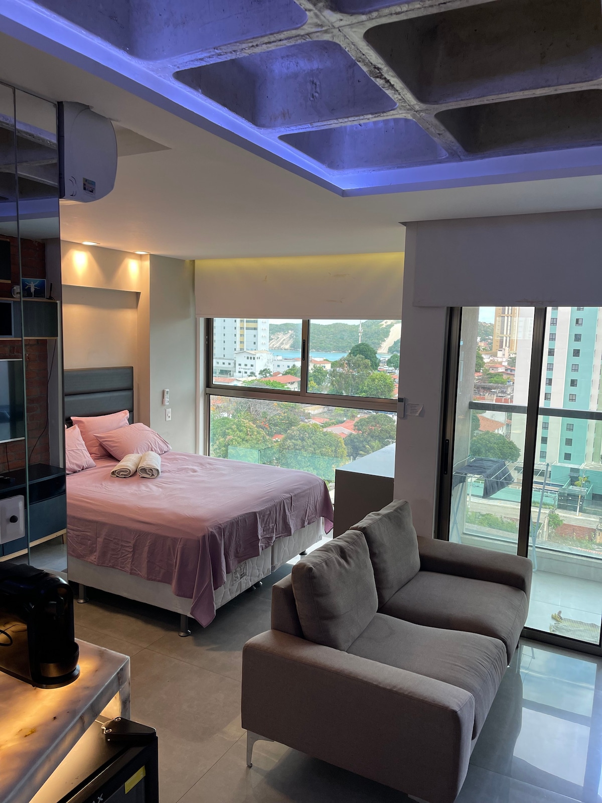 Relaxe neste espaço totalmente CLIMATIZADO.Apartamento único com vista mar, propriedade com acesso a praia e além de uma ótima piscina para adultos e crianças com Decker de madeira que dá visão para o morro do careca , apartamento completo com AR CONDICIONADO NA SALA E NO QUARTO , geladeira , fogão de uma boca por indução, máquina secadora , tv a cabo , wi-fi , estacionamento grátis e rotativo, limpeza diária lugar realmente ótimo para casal passar seu final de semana ou suas férias.